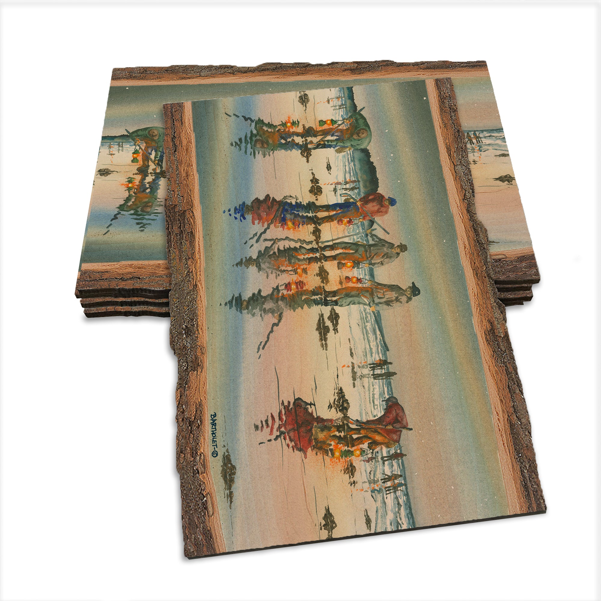 - Laser charred edge and colorful imagery to create a believable 'live edge'.