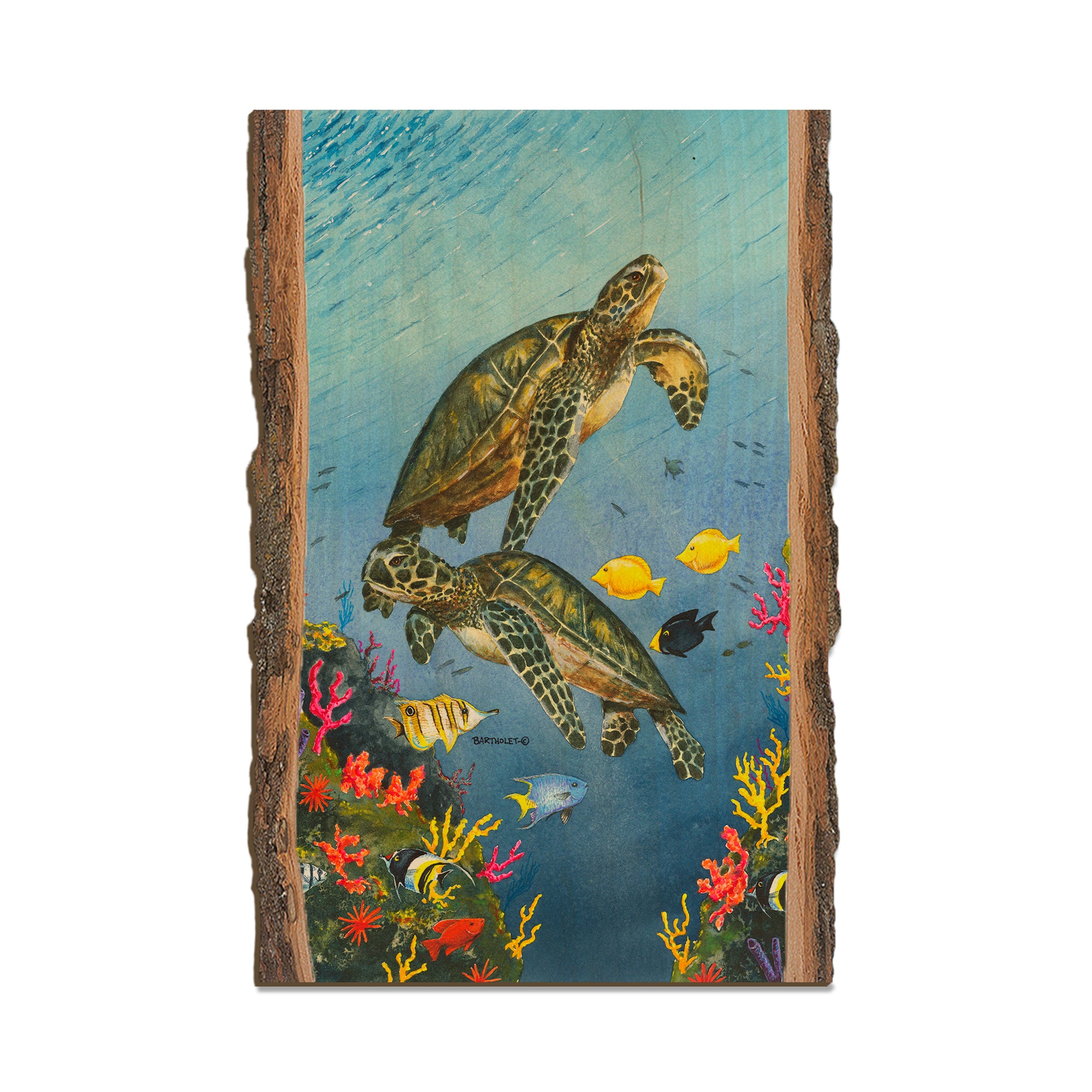 - Laser charred edge and colorful imagery to create a believable 'live edge'.