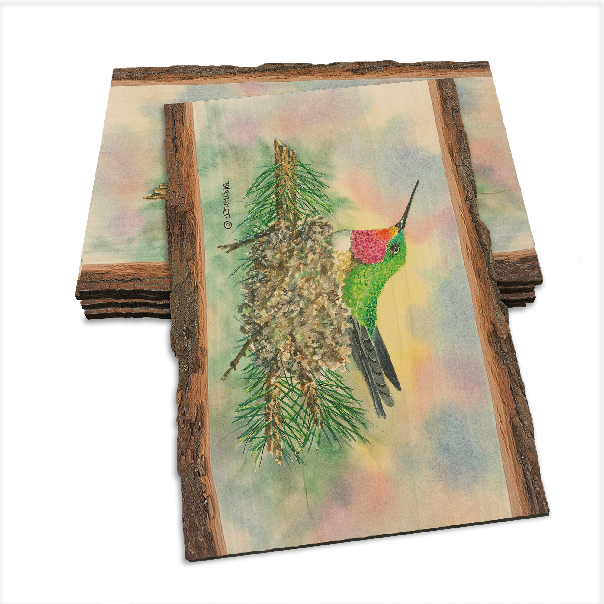 - Laser charred edge and colorful imagery to create a believable 'live edge'.