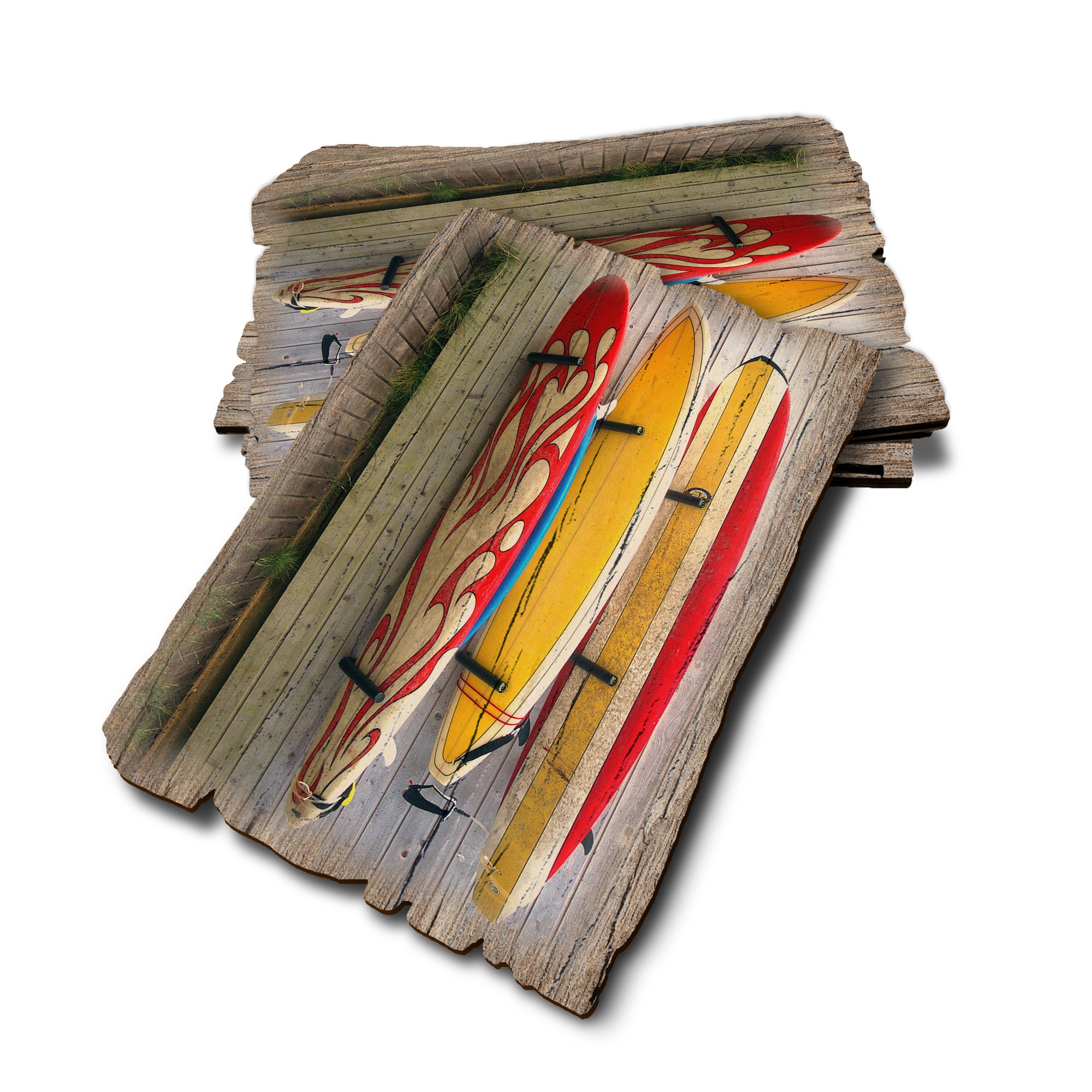 - Laser charred edge and colorful imagery creating a rustic and weathered look.