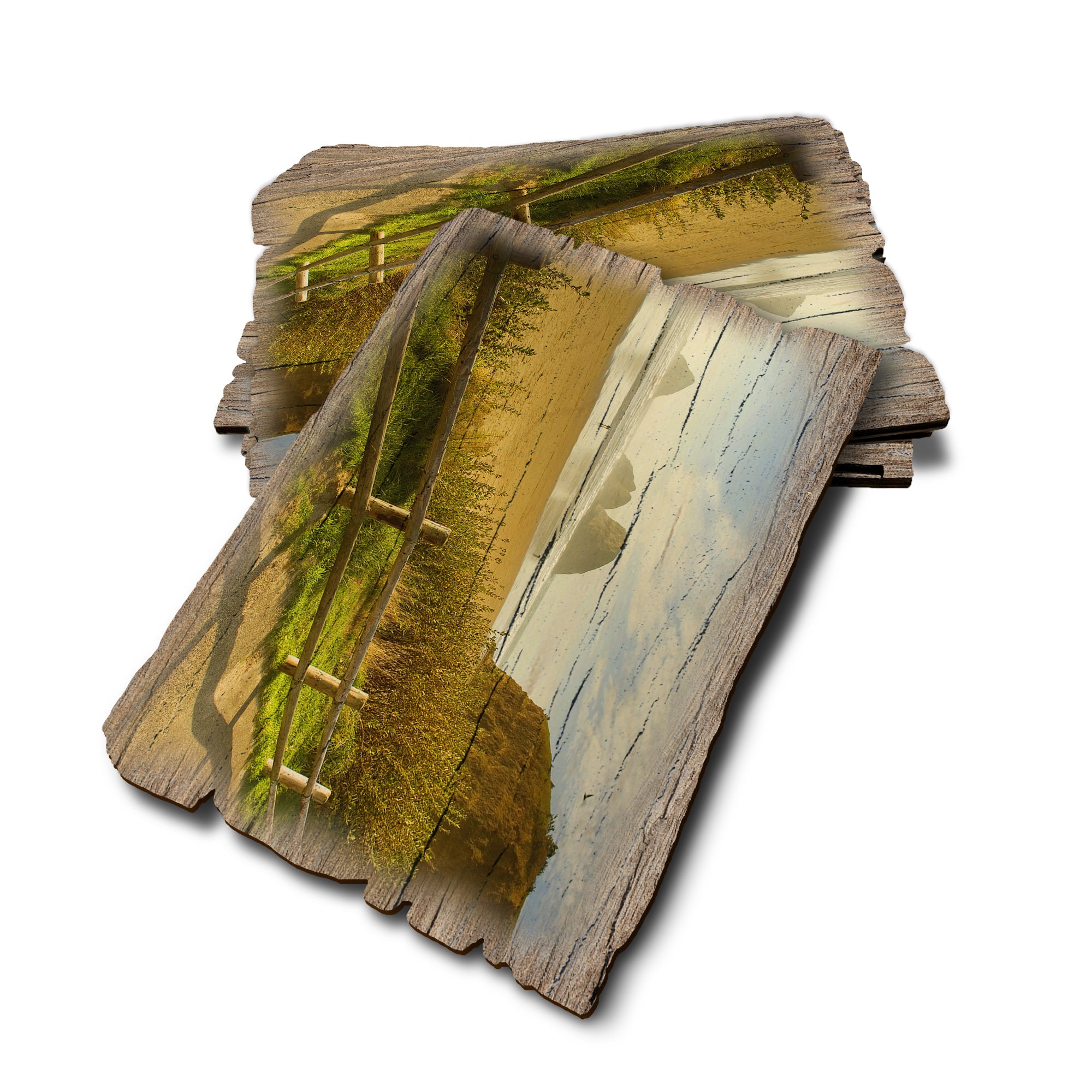 • Laser charred edge and colorful imagery creating a rustic and weathered look.