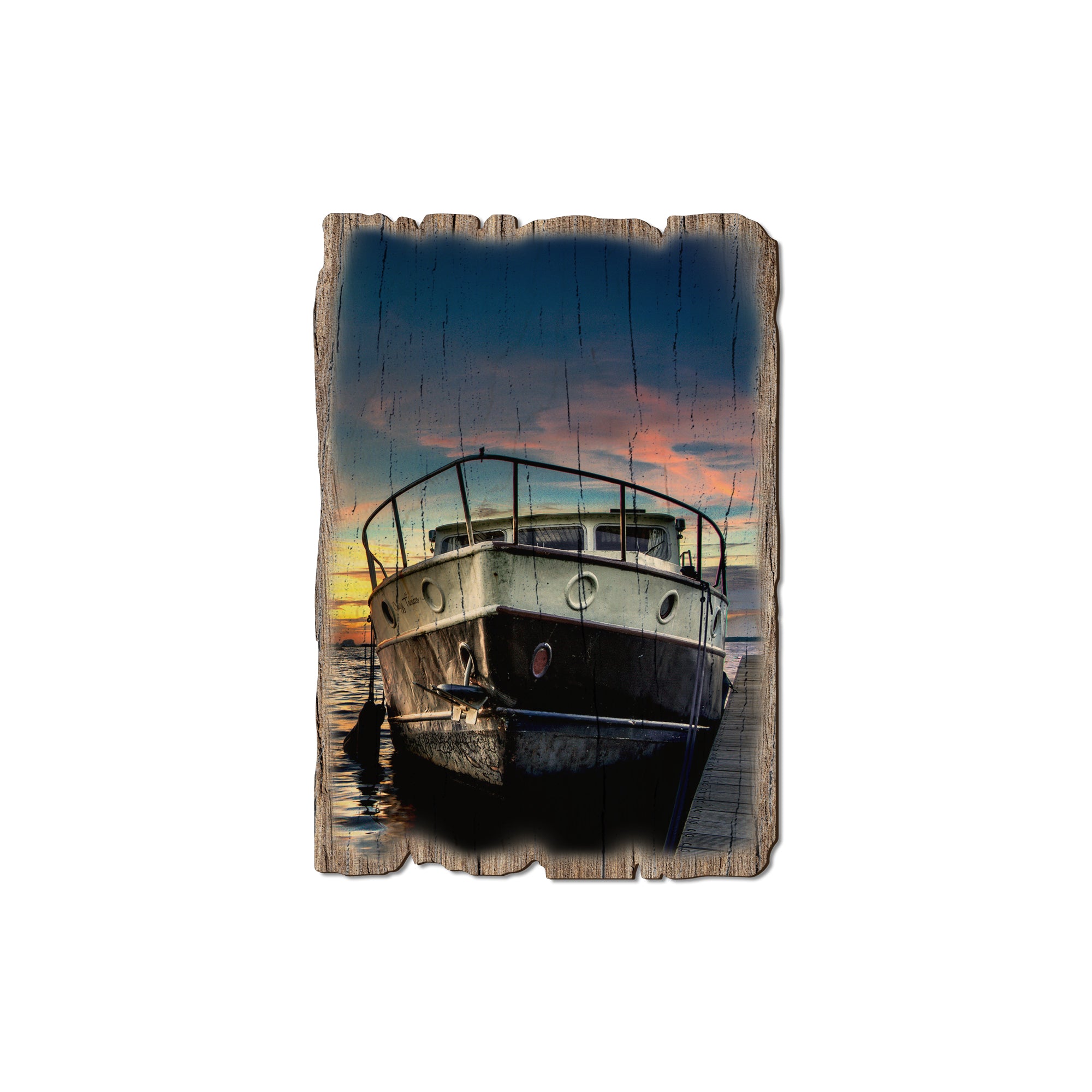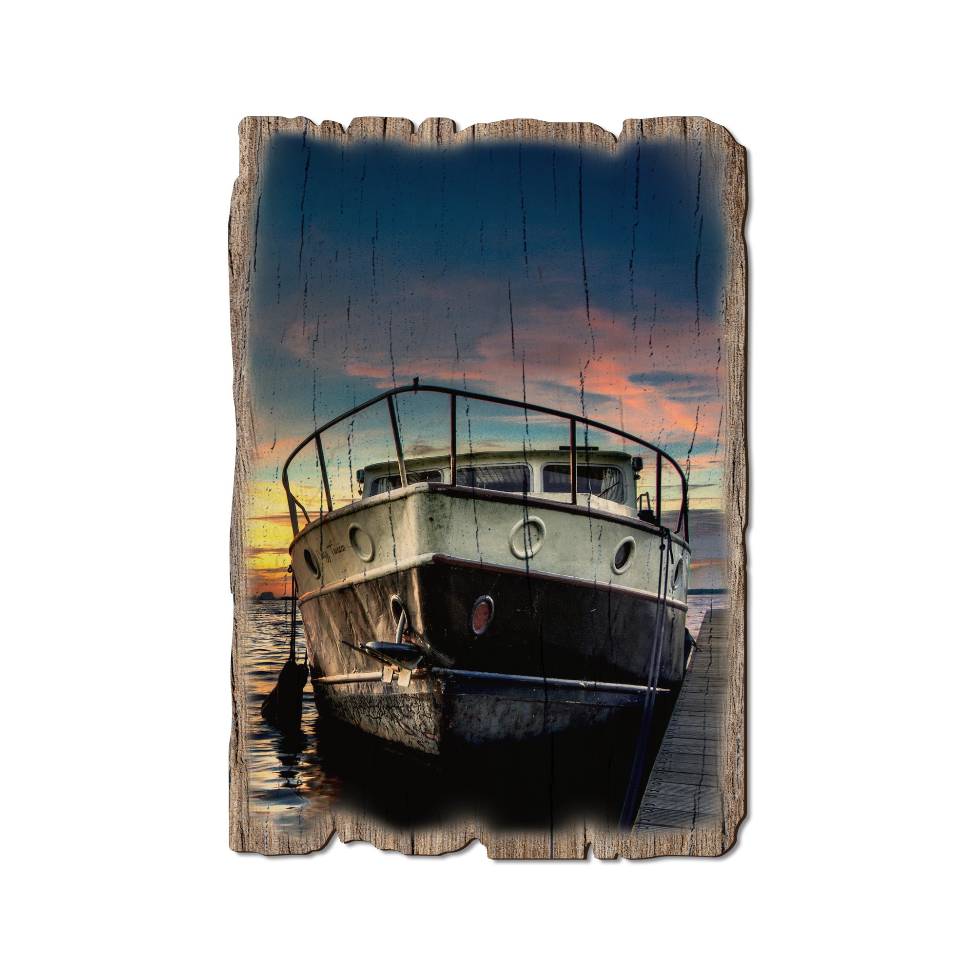 - Laser charred edge and colorful imagery creating a rustic and weathered look.