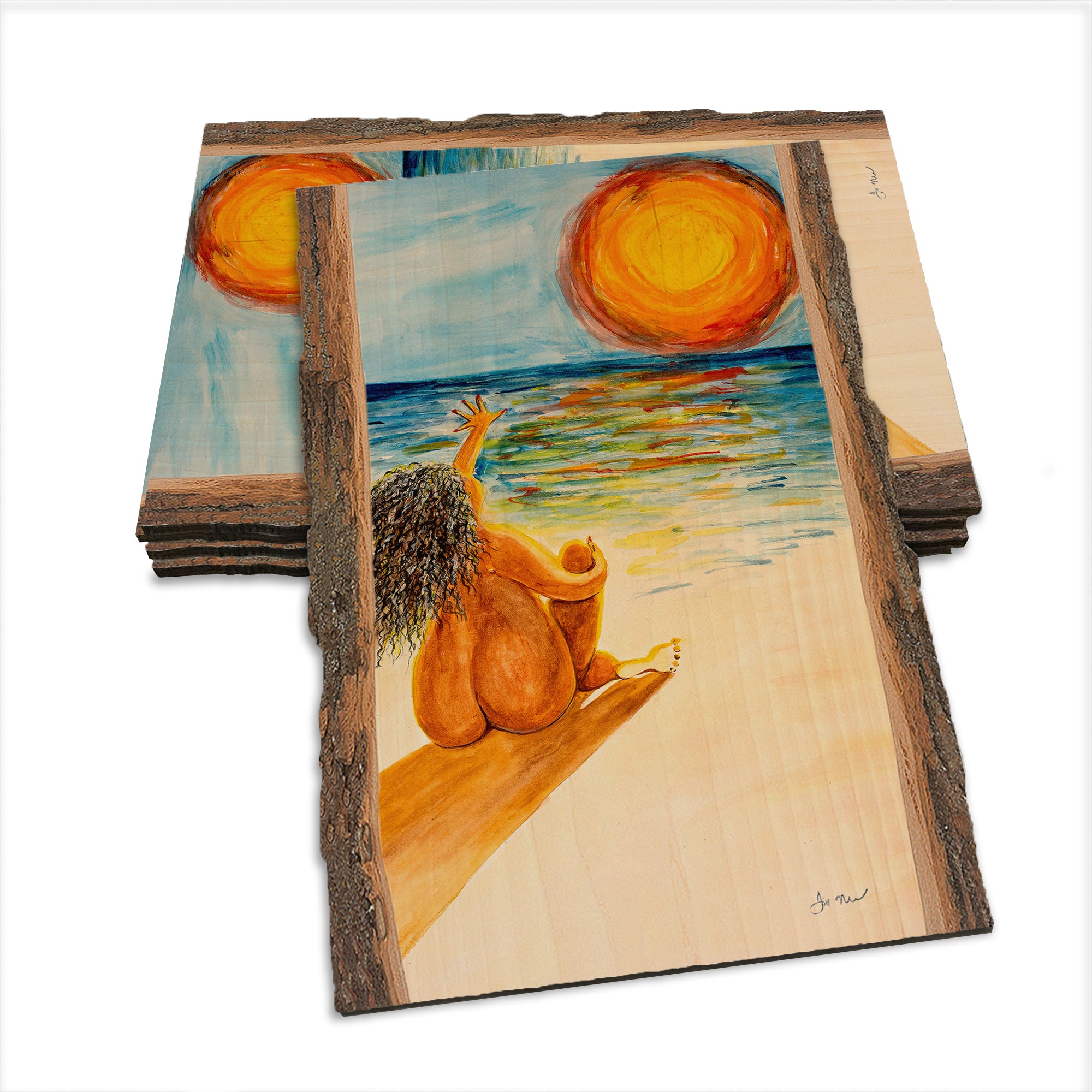 - Laser charred edge and colorful imagery to create a believable 'live edge'.