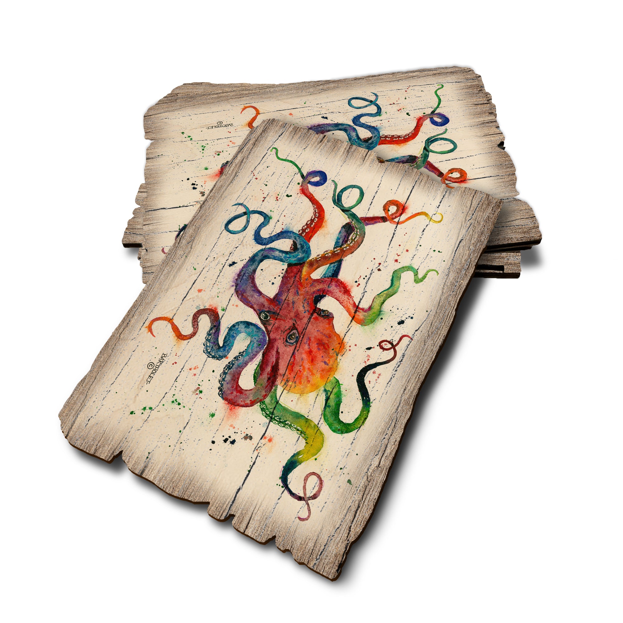 - Laser charred edge and colorful imagery creating arustic and weathered look.