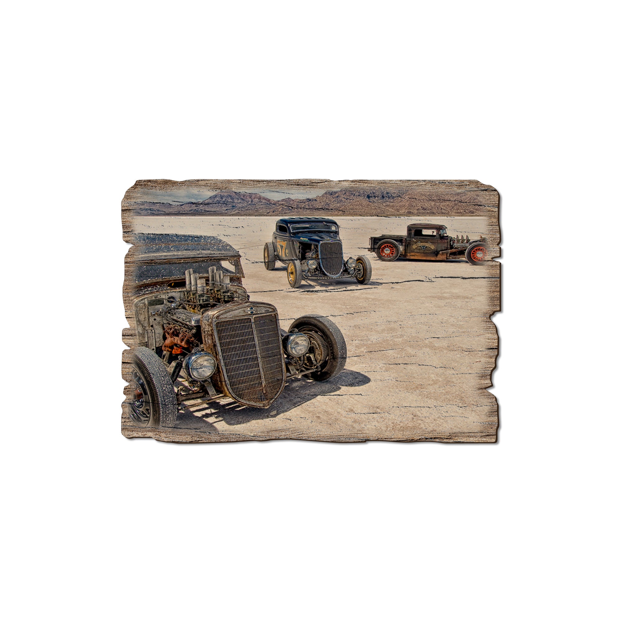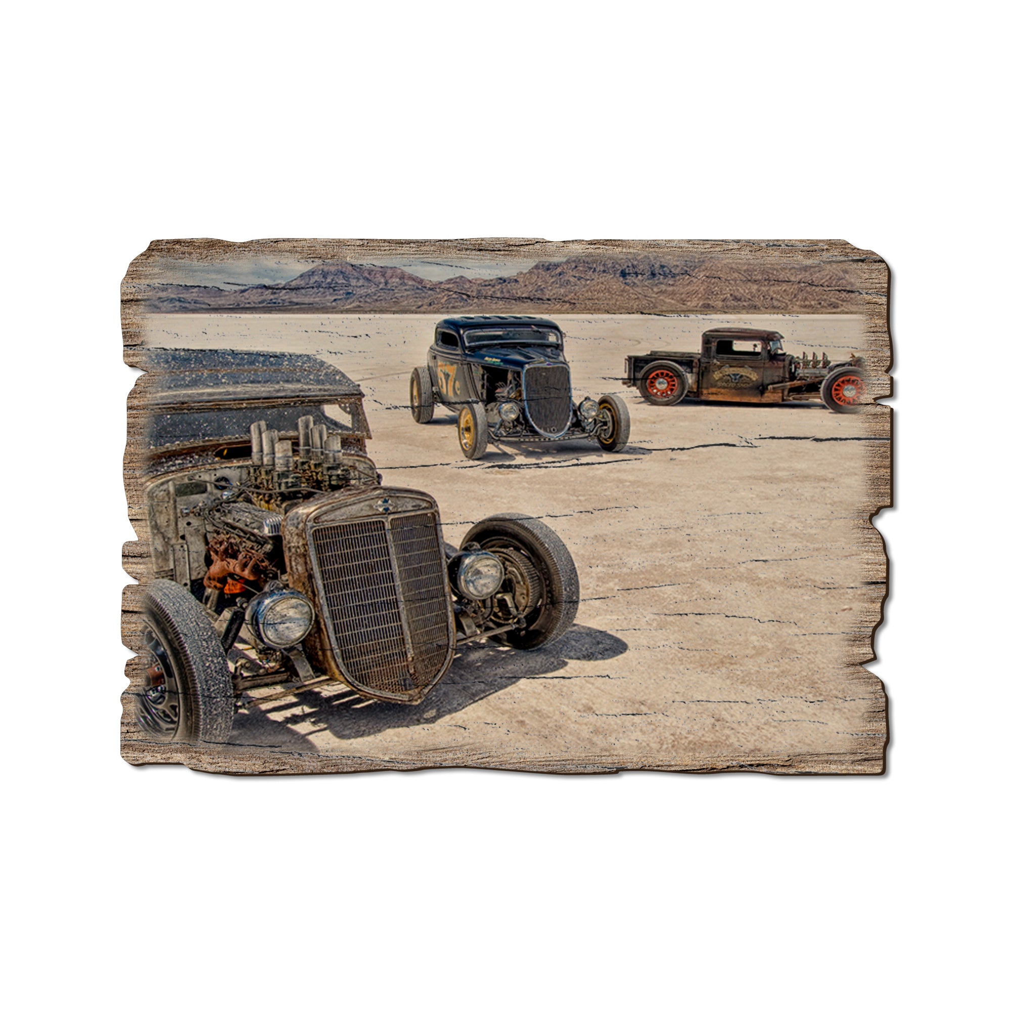 - Laser charred edge and colorful imagery creating a rustic and weathered look.