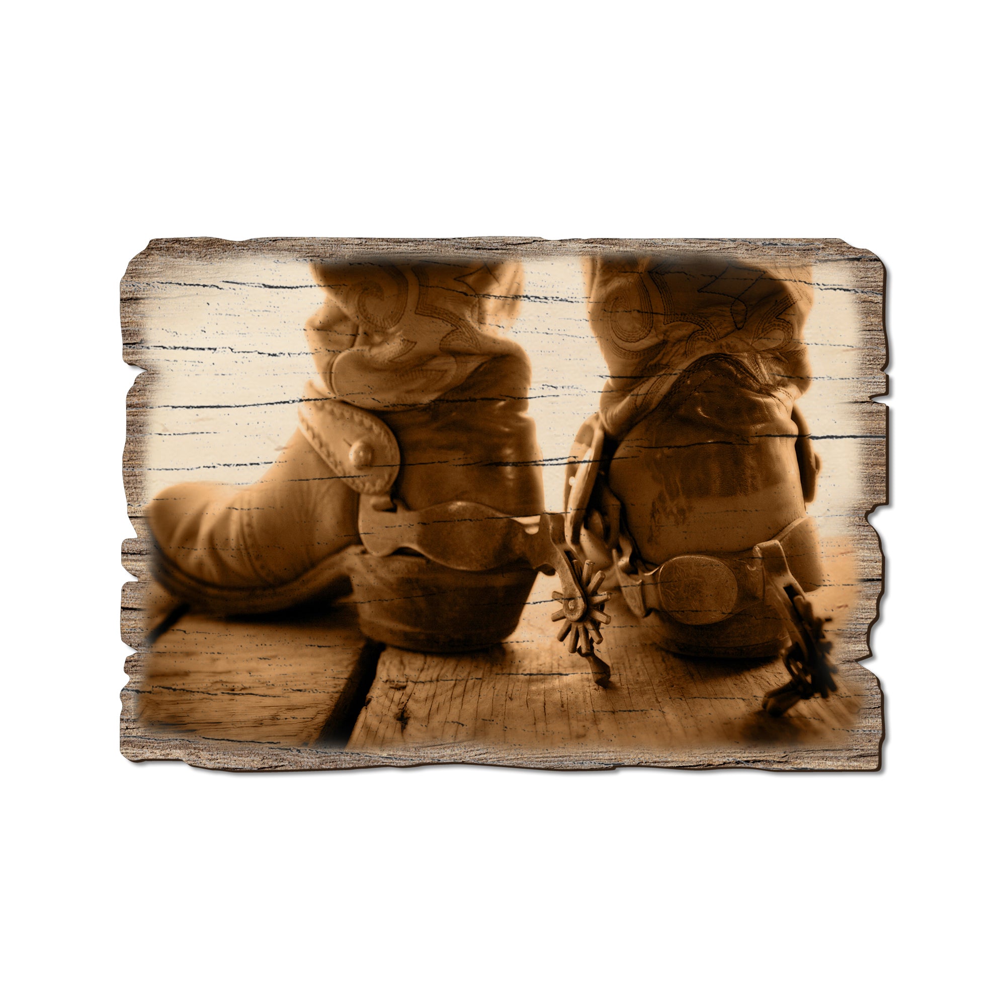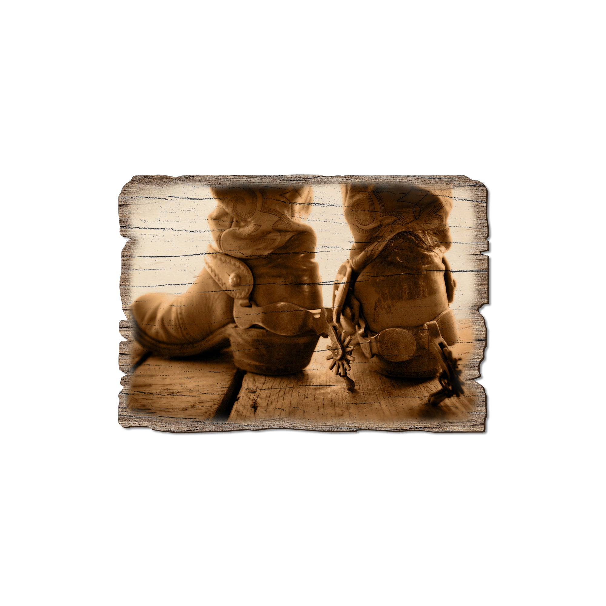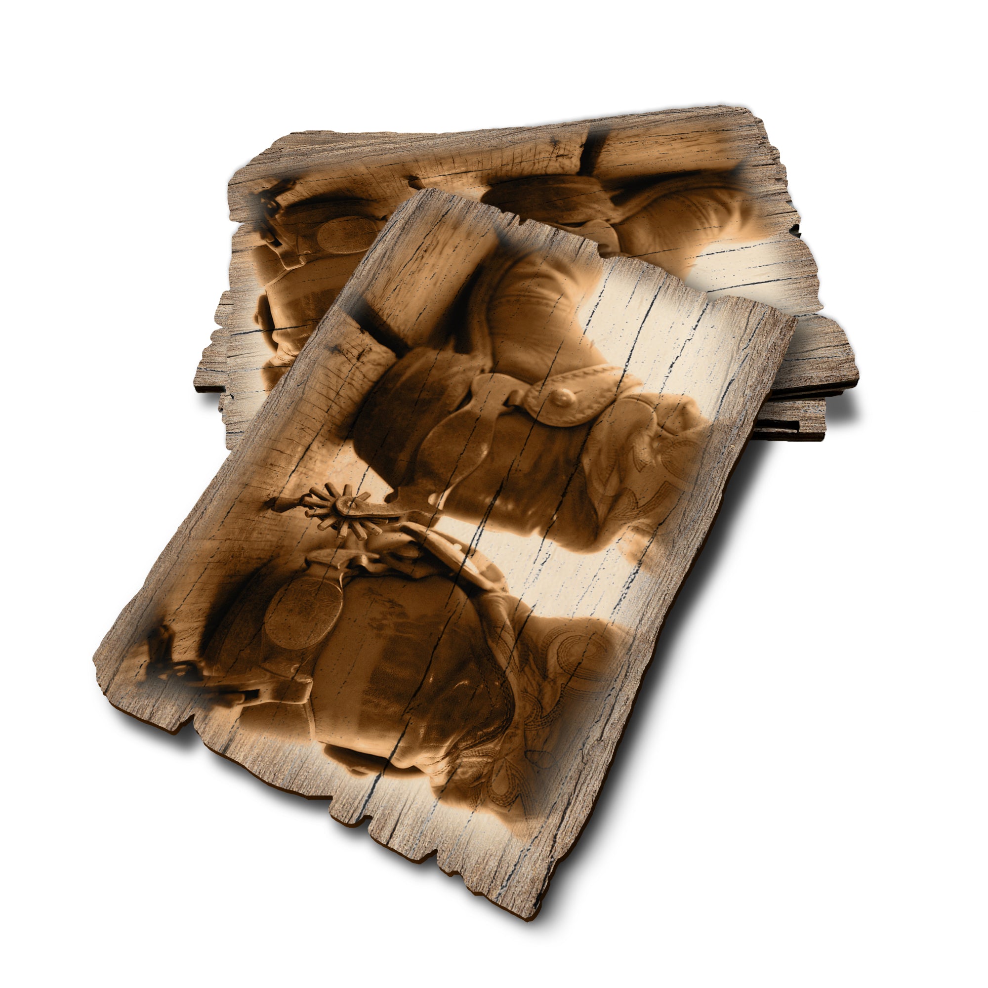 - Laser charred edge and colorful imagery creating a rustic and weathered look.